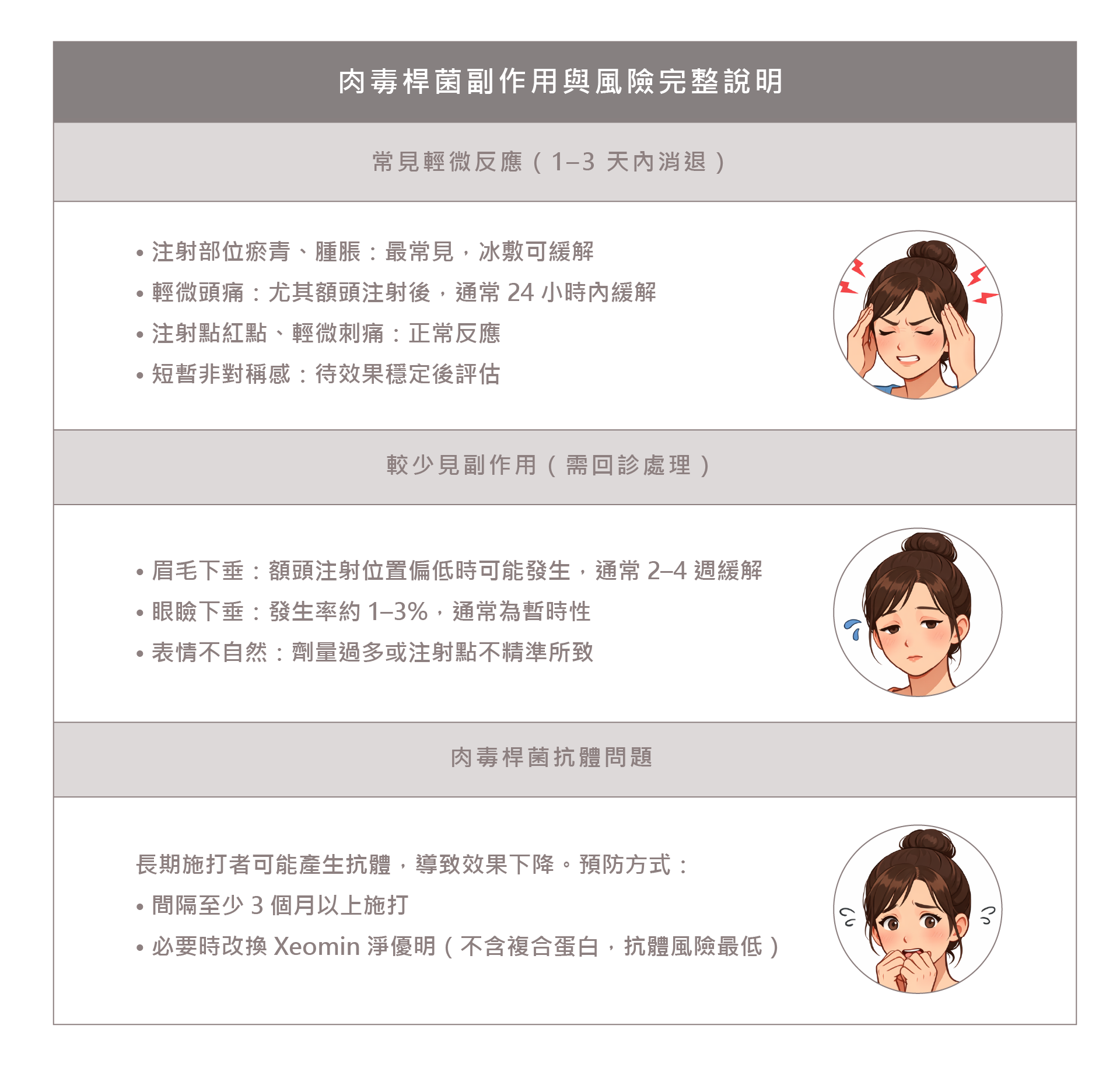 • 輕微頭痛:尤其額頭注射後,通常 24 小時內緩解